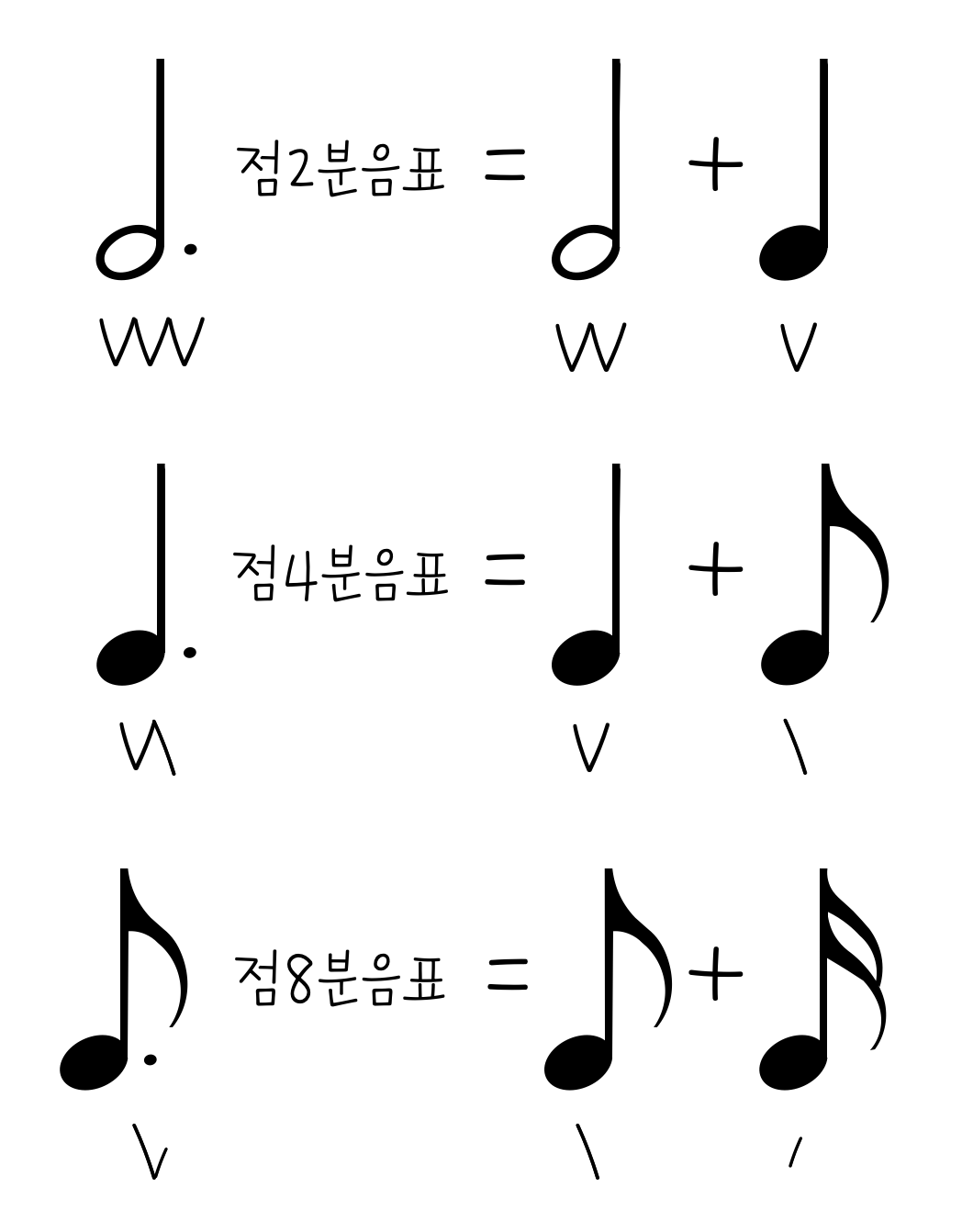 3. 점음표, 점쉼표 : 음표 뒤에 점이 붙은 형태를 말한다. 점은 음표 박자의 절반만큼을 더한다는 뜻이다.