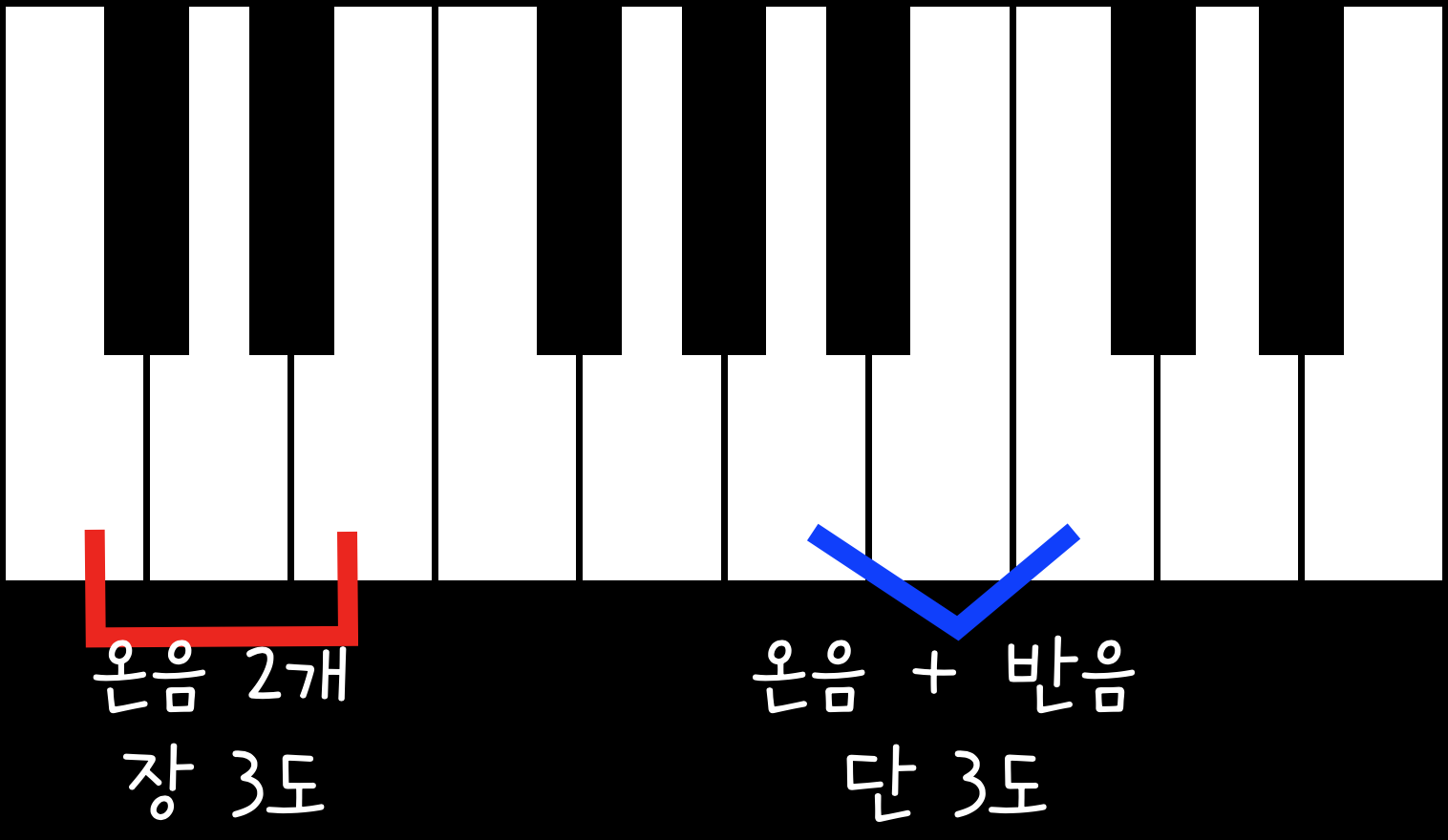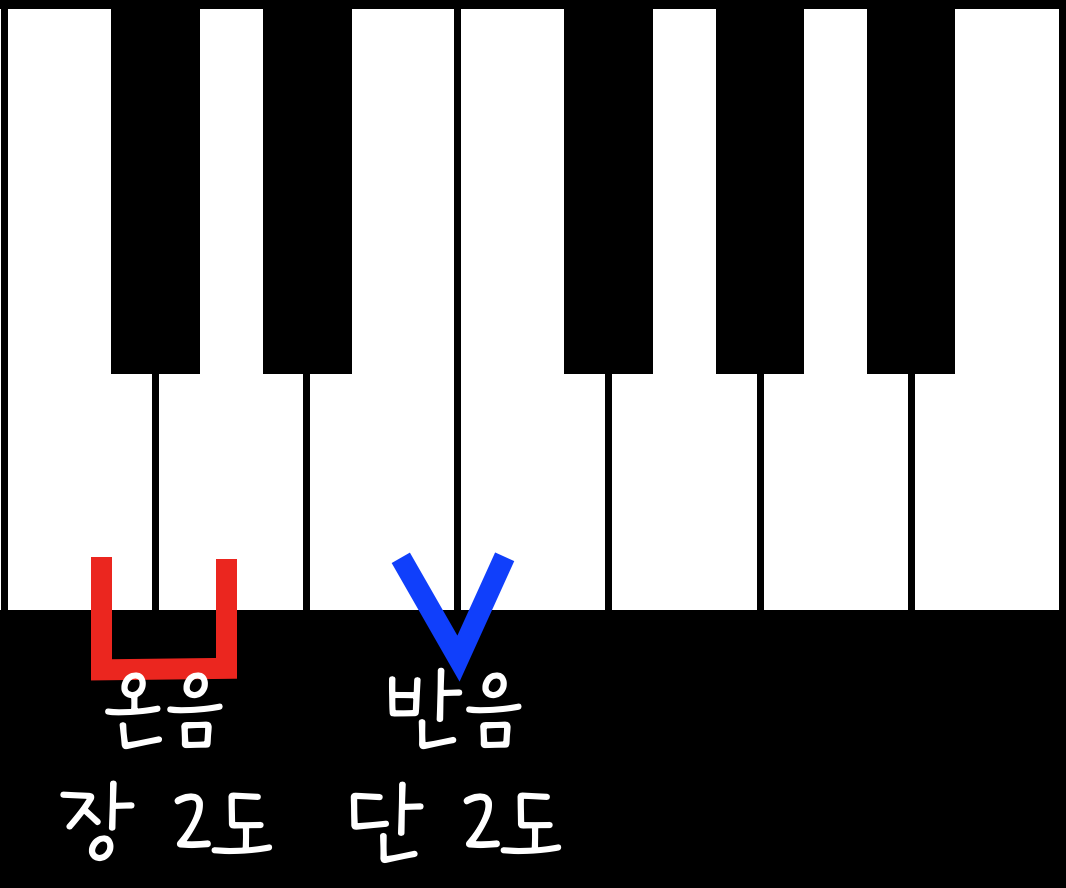 장음정과 단음정을 구분하는 가장 쉬운 방법은 바로 '반음의 유무'이다.