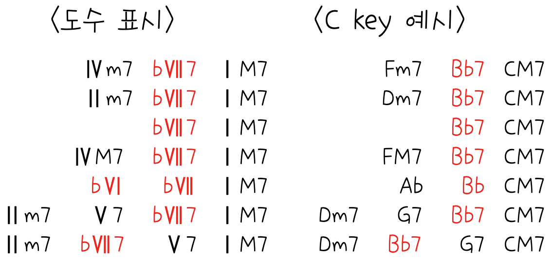 Ⅳm7 - bⅦ7 - ⅠM7 정리하면 아래와 같다. 이는 화성학적으로 Natural minor에서 빌려온 코드라고 보기도 한다.