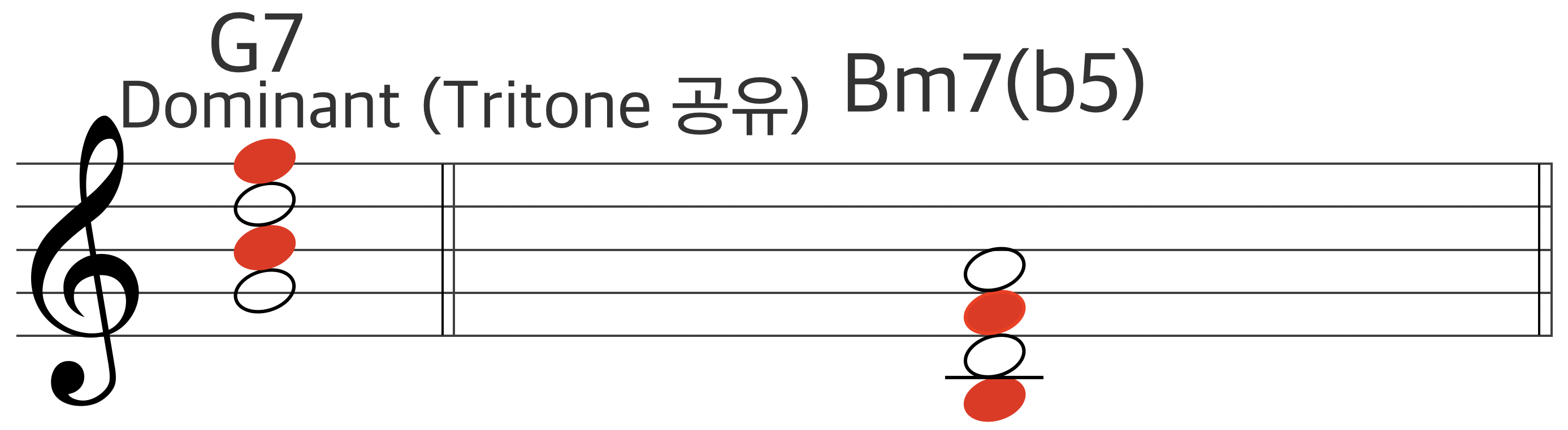 Dominant는 화음 구성음 안에 Tritone이라는 불협화음을 갖고 있다. 이 음정이 화음 성격을 결정하므로, Dominant는 예외적으로 Tritone을 공유하고 있어야 대리코드로 사용할 수 있다.