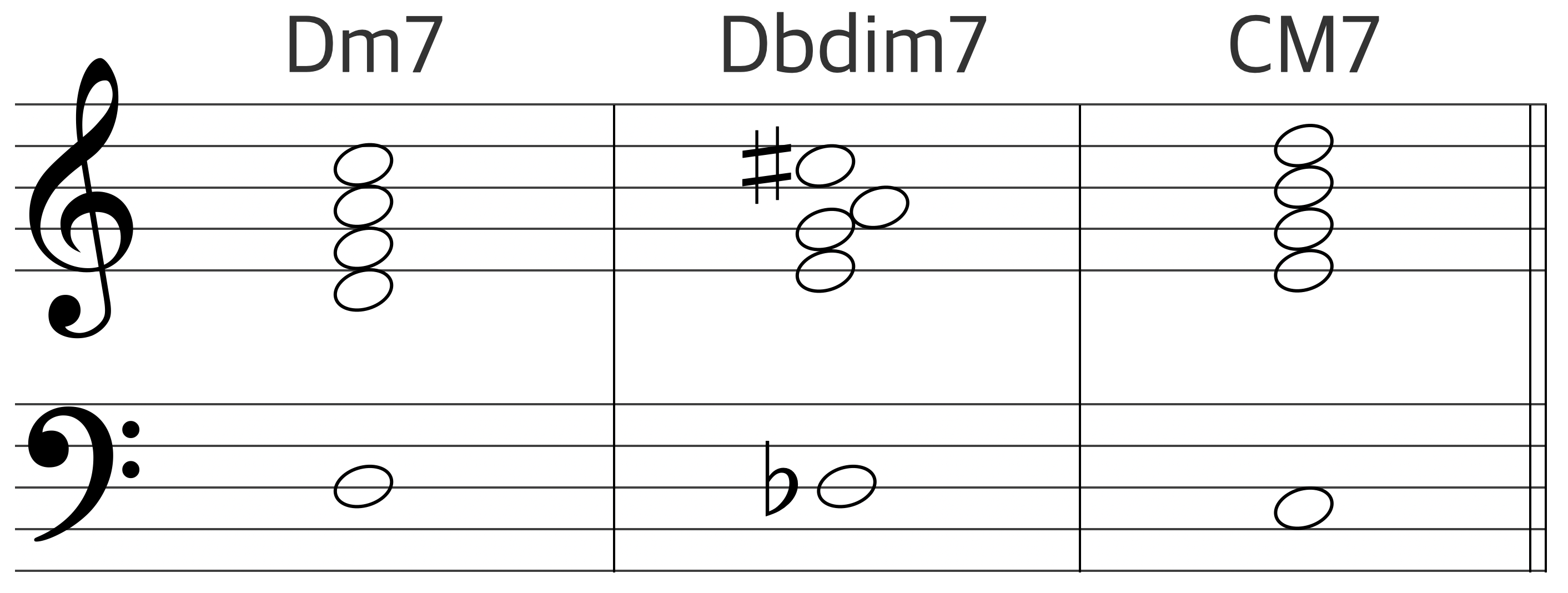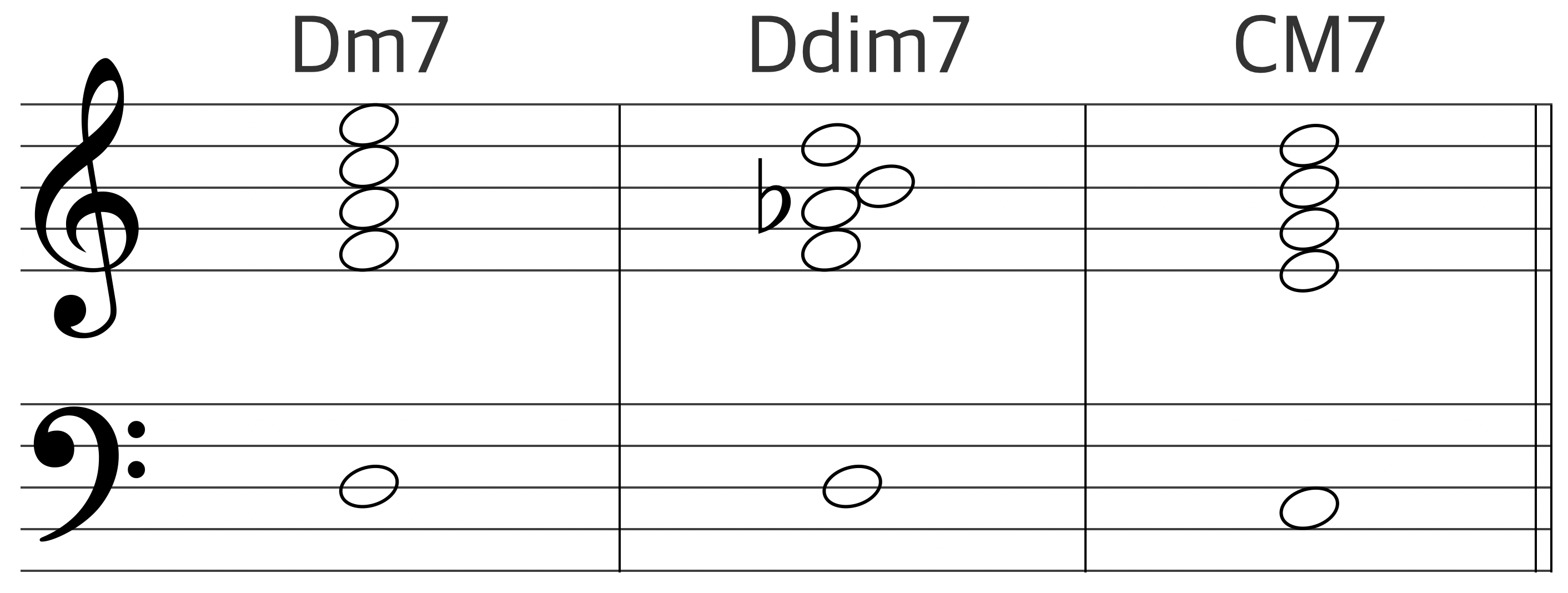 Dm7-G7-CM7에서 G7을 대신해서 Ddim7를 사용할 수 있다. Ddim7은 G7(b9)의 근음을 생략한 형태와 완벽히 동일한 구성음을 갖고 있어 동일한 기능을 수행하며, 어쿠스틱 피아노 반주법에서 절대 빠지지 않는 테크닉이다.