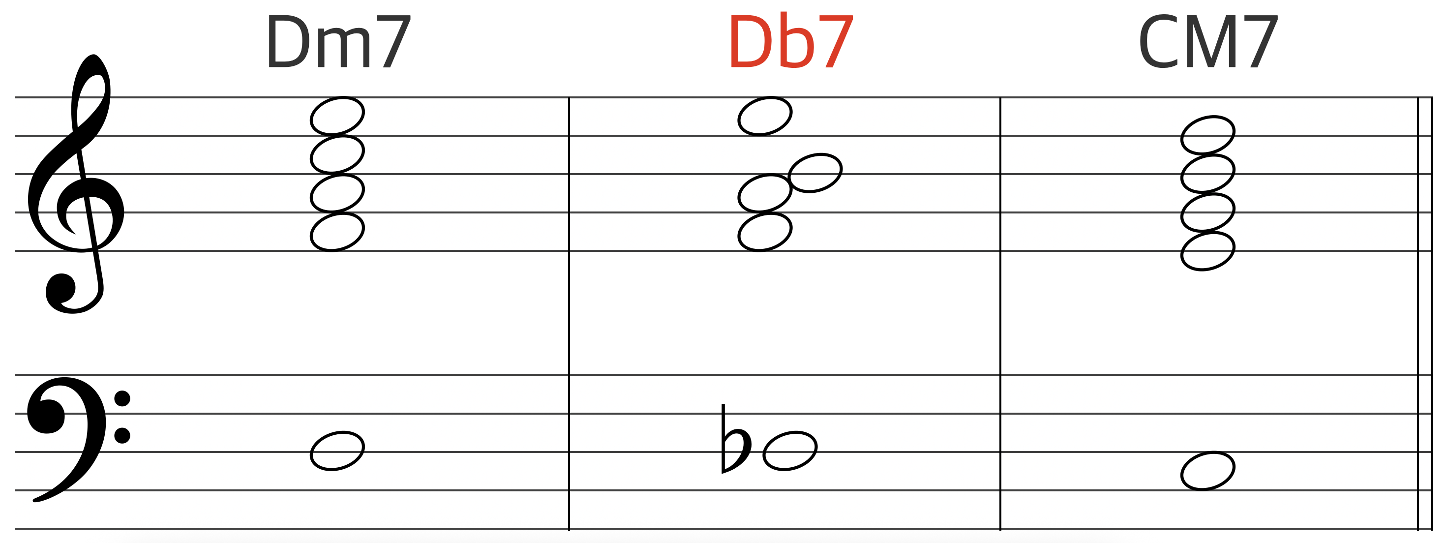 V7인 G7 대신, 트라이톤을 공유하는 대리코드 Db7을 사용했다. 베이스가 D - Db - C 로 반음씩 미끄러져 내려가는(크로매틱 디센딩) 라인이 형성되어, 독특한 R&B 그루브가 탄생한다. Db7에 #11 텐션(솔)을 사용하면 더 강한 조성감을 부여하여 인하모니를 느낄 수 있다.