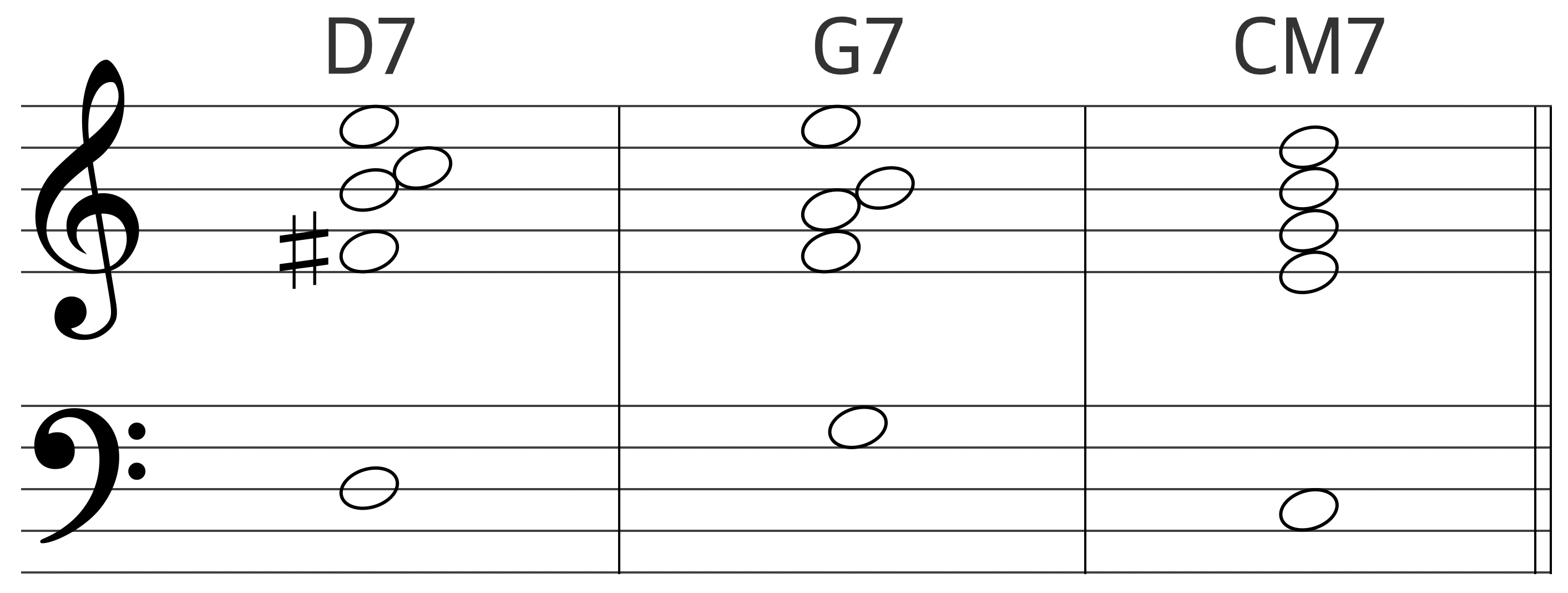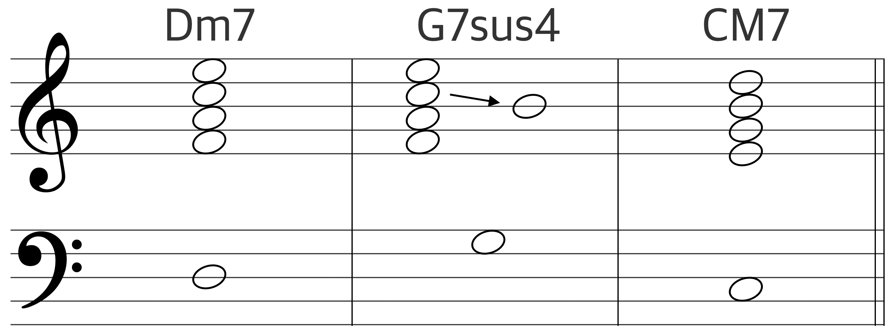 Dm7 - G7 - CM7 으로 이어지는 베이스 라인(D -> G -> C)은 화성학에서 가장 자연스럽고 강력한 진행으로 꼽히는 '완전 4도 상행(혹은 완전 5도 하행)'의 연속이기 때문이다. 이 강진행(Strong Progression)이 만들어내는 자연스러운 추진력이 투파이브원이 대중적으로 많이 사용되는 이유다.